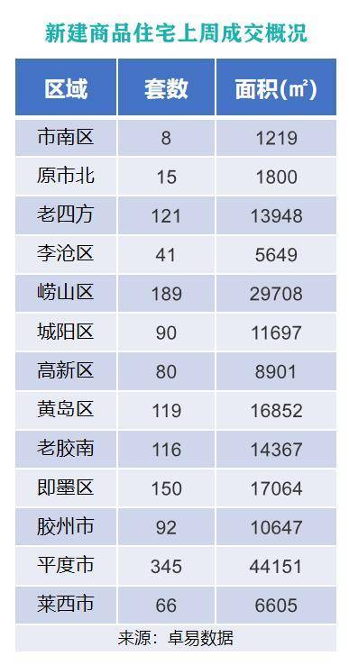 从各区成交情况来看,上周平度市新建商品住宅以成交面积44151㎡的成绩,位列上周各片区新建商品住宅成交面积榜首位;崂山区以成交面积29708㎡的成绩,位列成交面积榜第二位;即墨区以成交面积17064㎡的成绩,位列成交面积榜第三位。