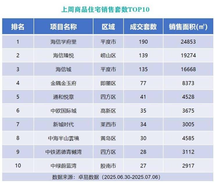 此外,金隅金玉府、通和悦章、中欧国际城、新城时代、中海半山雲境、中铁诺德青樾湾和中绿蔚蓝湾等项目进入销售榜前十位。上周青岛新建商品住宅成交前十榜单中,主城区有三个项目上榜,海信地产项目分列销售榜前三位。