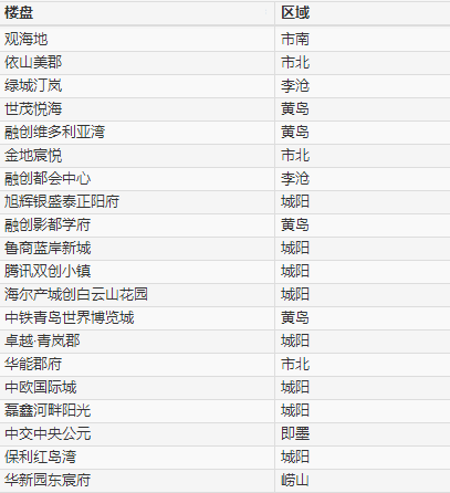 从青岛房地产专业网站搜狐焦点统计的青岛全域在售、待售楼盘购房者400来电咨询情况来看,最受购房者关注的楼盘前十名分别为观海地(市南区);依山美郡(市北区)、绿城汀兰(李沧区)、世贸悦海(西海岸新区)、融创维多利亚湾(西海岸新区)、金地宸悦(市北区)、融创都会中心(李沧区)、旭辉银盛泰正阳府(城阳区)、融创影都学府(西海岸新区)、鲁商蓝岸新城(城阳区)。