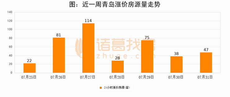 根据诸葛找房数据显示,青岛24小时涨价房源量为47套,较07月30日增加9套,环比上涨23.7%。与此同时,涨价房源占比小幅扩大,业主信心有所提升。
