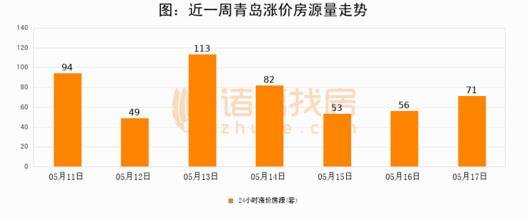 根据诸葛找房数据显示,青岛24小时涨价房源量为71套,较05月16日增加15套,环比上涨26.8%。与此同时,涨价房源占比小幅扩大,业主信心有所提升。