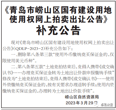 现对《青岛市崂山区国有建设用地使用权网上拍卖出让公告》(QDLP-2023-2)补充公告如下: