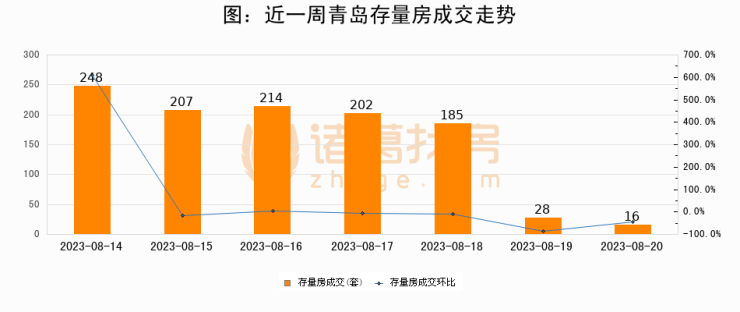 从存量房来看,2023年08月20日青岛存量房单日成交16套,比昨日减少12套,环比下降42.9%。从近一周存量房成交来看,青岛存量房日均成交套数为157套,08月20日单日成交16套,低于近一周平均水平89.8%。