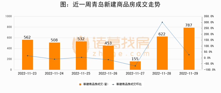 根据青岛市住房和城乡建设局数据显示,2022年11月29日青岛新建商品房成交787套,较昨日增加165套,环比上涨26.5%