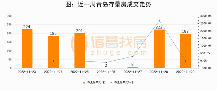 从存量房来看,2022年11月29日青岛存量房单日成交197套,比昨日减少25套,环比下降11.3%。从近一周存量房成交来看,青岛存量房日均成交套数为148套,其中11月23日成交量最高为224套,11月29日单日成交197套,高于近一周平均水平33.1%。