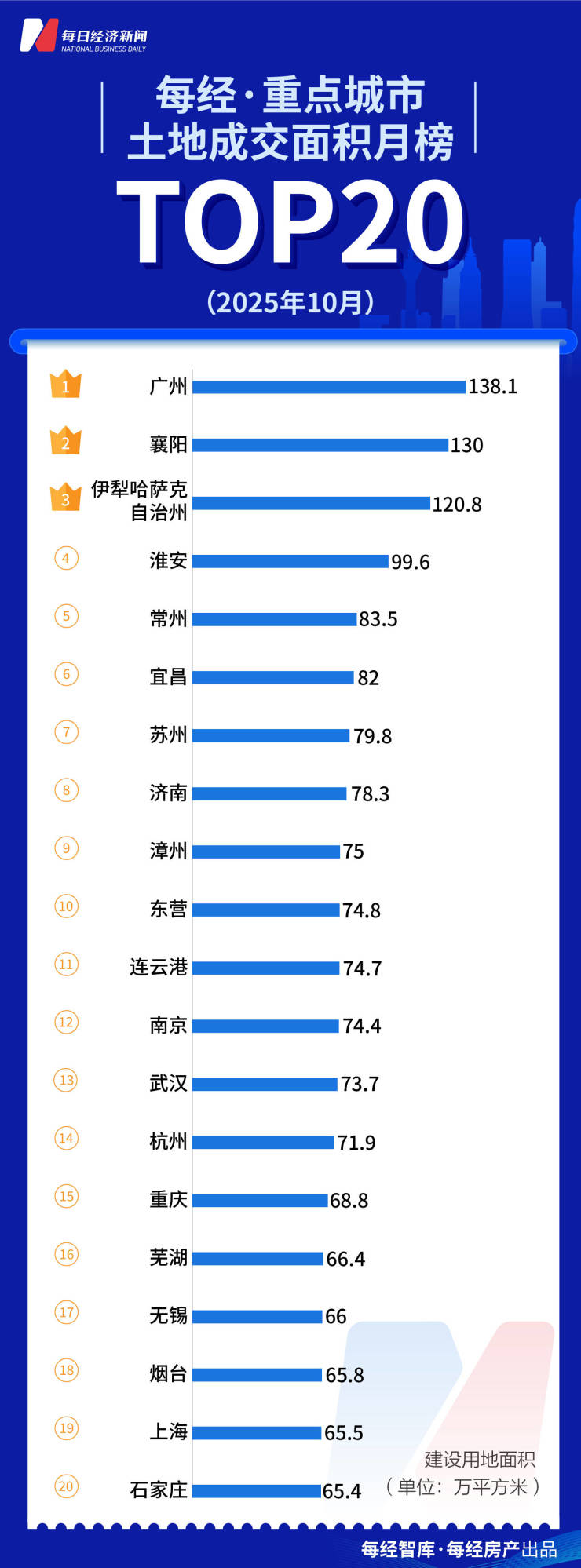 10月份,TOP20城市土地出让面积合计1654.5万平方米,出让面积超百万平方米的城市减少至3个,TOP20门槛值为65.4万平方米。据中指研究院,1~10月300城住宅用地成交规划建面同比下降约12%,出让金同比增长4%,累计增幅持续收窄。
