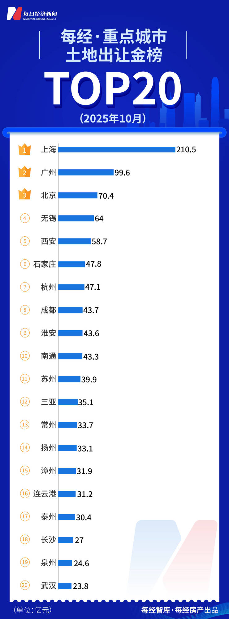 10月份,土地出让金超过100亿元的城市仅有上海,为210.5亿元。TOP20城市土地出让金合计1039.4亿元,环比9月份稍有回落。据中指研究院统计,房企保持深耕聚焦下,上海、杭州土拍热度持续,成都、青岛优质地块举牌意愿较高。