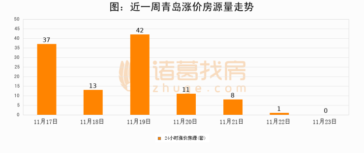 根据诸葛找房数据显示,青岛24小时涨价房源量为0套,较11月22日减少1套,环比下降100%。与此同时,涨价房源占比小幅回落,对于购房者来说是一个入市窗口期,购房者可抓住时机入市。