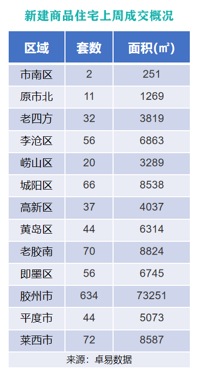 从各区成交情况来看,上周胶州市新建商品住宅以成交面积73251㎡的成绩,位列上周各片区新建商品住宅成交面积榜首位;原胶南以成交面积88824㎡的成绩,位列成交面积榜第二位;莱西市以成交面积8587㎡的成绩,位列成交面积榜第三位。