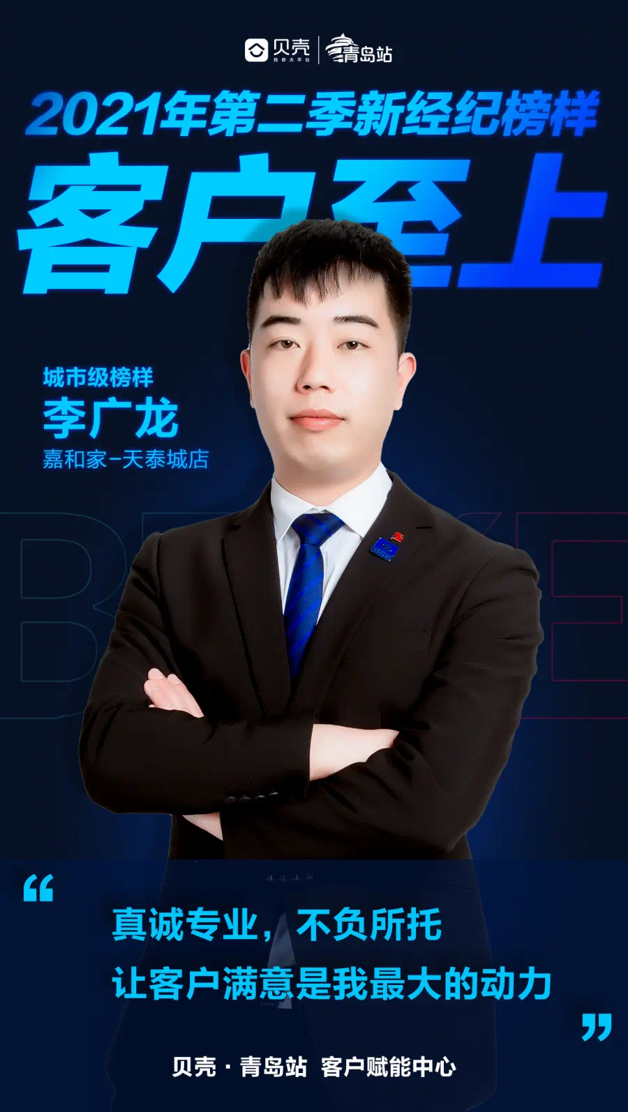 客户至上榜样李广龙是来自青岛嘉和家不动产城阳区天泰城店的租赁经纪人,2020年12月19日入职,之前有五年的消防兵经历,平时话不多,但从他的眼神里总能看出一份真诚,一份责任。入职排名前列个月,就签了10单房屋租赁单,而他的开单秘诀就是“对客户好,站在客户的角度想问题,做到客户至上”
