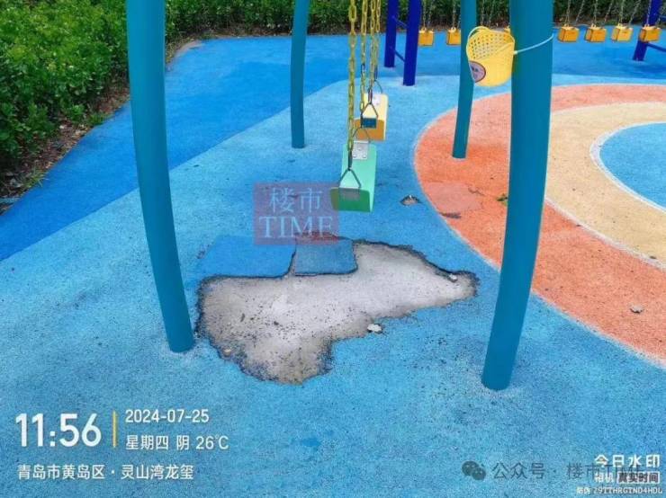 灵山湾龙玺小区院子路面看着是大理石,其实是瓷砖,塑胶跑道下面垫层都露出来了,不知道有没有垫层,破裂的地方很多……