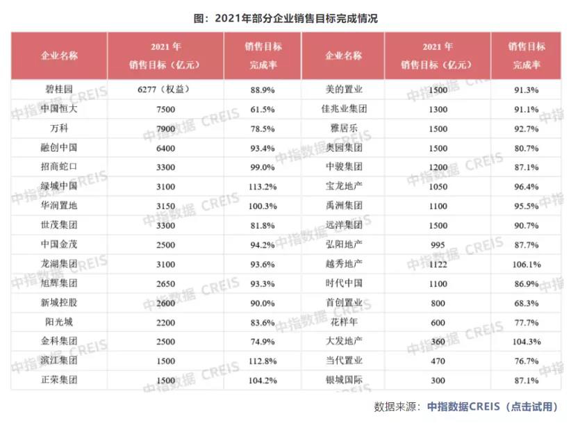根据中指研究院数据显示,碧桂园、中国恒大、万科、融创中国均未完成此前设定的销售目标。尽管保利发展未公开2021年的销售目标,但国金证券在其报告中提到,保利发展2021年销售金额5349.29亿元,实际上相当于完成年初目标的约97%。