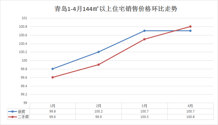 5月17日,国家统计局发布了4月份70个大中城市商品住宅销售价格变动情况,从整体数据上来看,全国的新房、二手房市场热度持续走高。与此相同的,青岛新建商品住宅和二手住宅销售价格也环比上涨,而且在各面积段的分类比较中,144㎡以上的新房、二手房价格环比涨幅较大,其中新房的价格相较去年同期同比上涨5.9%。