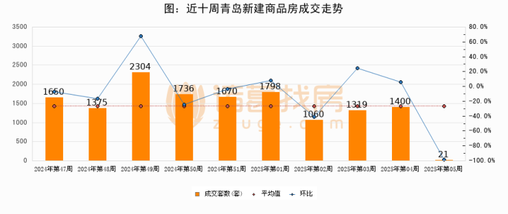 进入2025年第05周(01月27日-02月02日),青岛新建商品房成交21套,较上周减少1379套,环比下降98.5%