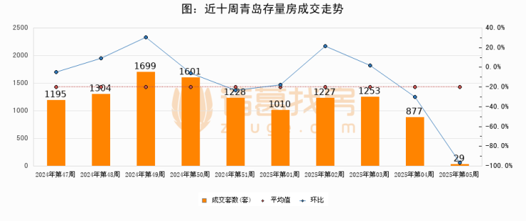 存量房方面,第05周青岛存量房成交29套,较上周减少848套,环比下降96.7%。从近十周成交走势来看,周均成交套数为1142套,本周低于平均水平97.5%。