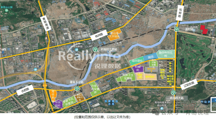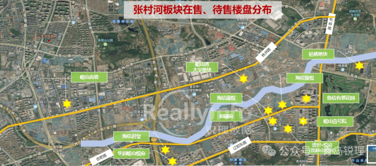 目前张村河出让地块基本都在南岸,加上此次计划出让的枯桃地块,南岸共计出让7宗地块,北岸仅出让大宇一宗地块。目前张村河板块在售项目有海信君玺、海信璟悦、鲁信有邻花园、崂山尚境、越秀青铁和樾府、盛世悦府(原名静山悦园)、海信臻悦等项目,北岸大宇地块目前尚未入市。