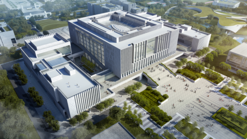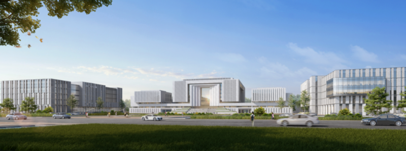 其中,学习综合体建筑面积约10万平方米,为校园标志性建筑,形体方正简洁,设计理念为“承山纳海,远瞩未来”。立面采用竖向线条,两侧体量通过明快和节奏感来象征排列整齐的书本。