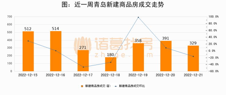 根据青岛市住房和城乡建设局数据显示,2022年12月21日青岛新建商品房成交329套,较昨日减少62套,环比下降15.9%。近一周青岛新建商品房日均成交365套,其中,12月16日成交量最高为514套。12月21日单日成交329套,低于近一周平均水平9.9%。