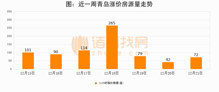 根据诸葛找房数据显示,青岛24小时涨价房源量为72套,较12月20日增加30套,环比上涨71.4%。与此同时,涨价房源占比小幅扩大,业主信心有所提升。