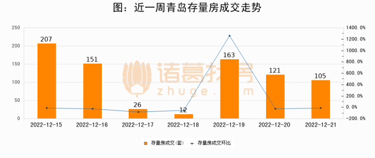 从存量房来看,2022年12月21日青岛存量房单日成交105套,比昨日减少16套,环比下降13.2%。从近一周存量房成交来看,青岛存量房日均成交套数为112套,其中12月15日成交量最高为207套,12月21日单日成交105套,低于近一周平均水平6.2%。