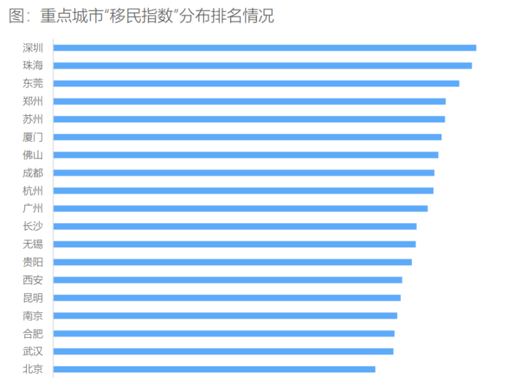 我们对交易量进行百分统计,本地消费者交易百分占比越低,其他城市消费者交易百分占比相应越高,因此,我们定义,本地百分占比较低的城市为“移民城市”,同时进行标准化处理,计算出移民指数,指数越高,外地交易百分占比越高。