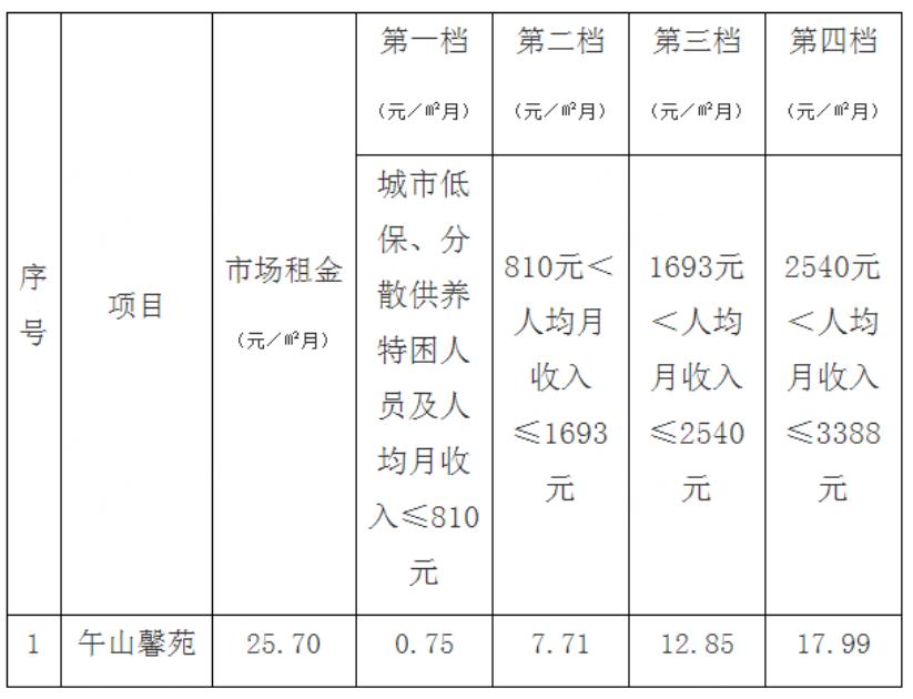 配租家庭按照收入情况实施差别化租金标准,本次公共租赁住房配租房源市场租金及差别化租金根据《青岛市发展和改革委员会 青岛市住房和城乡建设局 青岛市财政局 关于市北区万科紫台等公共租赁住房项目租金标准有关事项的通知》(青发改价格〔2020〕153号)规定,标准明细如下: