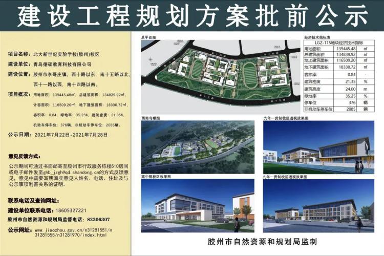 根据公示内容,北大新世纪实验学校(胶州)校区项目建设地点位于胶州市G204国道与大沽河交界的东南侧,用地面积139445.48平方米,总建筑面积134839.92平方米,计容面积116509.2平方米,地下建筑面积18330.72平方米,绿地率35.25%,计划机动车停车位376辆,非机动车停车位2085辆。