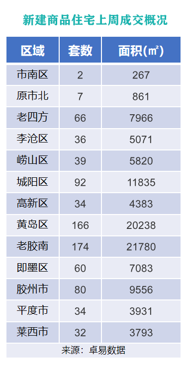 从各区成交情况来看,上周高新区新建商品住宅以成交面积35936㎡的成绩,位列上周各片区新建商品住宅成交面积榜首位;城阳区以成交面积18740㎡的成绩,位列成交面积榜第二位;原黄岛区以成交面积15246㎡的成绩,位列成交面积榜第三位。