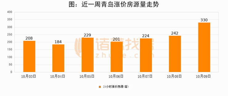根据诸葛找房数据显示,青岛24小时涨价房源量为330套,较10月08日增加88套,环比上涨36.4%。与此同时,涨价房源占比小幅扩大,业主信心有所提升。