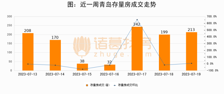 从存量房来看,2023年07月19日青岛存量房单日成交213套,比昨日增加14套,环比上涨7%。从近一周存量房成交来看,青岛存量房日均成交套数为157套,07月19日单日成交213套,高于近一周平均水平35.7%。