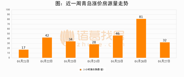 根据诸葛找房数据显示,青岛24小时涨价房源量为32套,较04月26日减少49套,环比下降60.5%。与此同时,涨价房源占比小幅回落,对于购房者来说是一个入市窗口期,购房者可抓住时机入市。