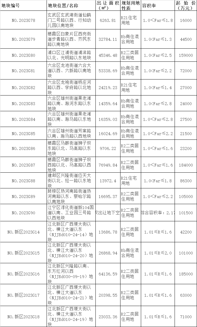 NO.新区2023G15地块为江北新区广西埂大街以北、横江大道以东(NJJBd010-24-20)地块,东至规划路,南至广西梗大街,西至胜利路,北至规划路。该地块规划用地性质为Rb商住混合用地,出让面积26868.94平方米,容积率1.01≤R≤2.0,建筑高度≤80米,挂牌起始价10.1亿元。