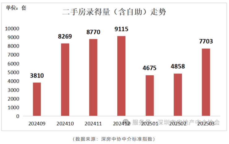 注:在深圳房地产市场,一般认为二手房月成交量5000套为“荣枯线”。当成交量高于此水平时,市场相对活跃,交易较为旺盛,市场呈现繁荣景象;反之,市场则相对冷清。而“繁荣线”通常以月成交量8000套为标准。若二手房月成交量能达到或超过8000套,意味着市场需求旺盛,交易活跃,房地产市场处于繁荣状态。