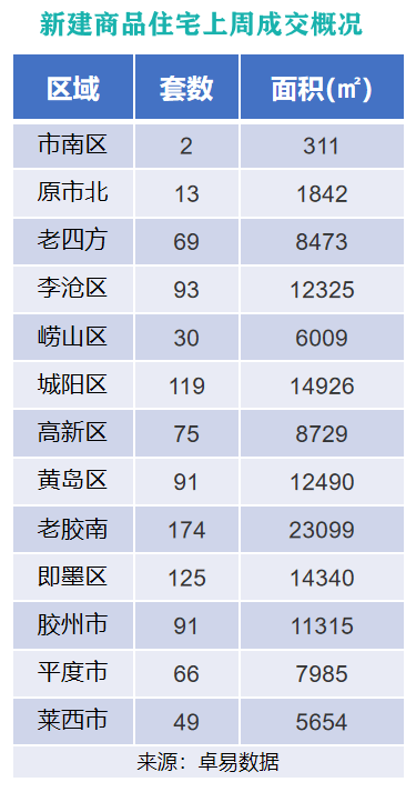 从各区成交情况来看,上周原胶南市新建商品住宅以成交面积23099㎡的成绩,位列上周各片区新建商品住宅成交面积榜首位;城阳区以成交面积14926㎡的成绩,位列成交面积榜第二位;即墨区以成交面积14340㎡的成绩,位列成交面积榜第三位。