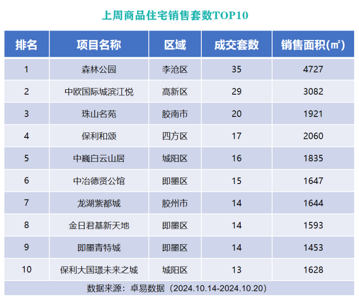 从各项目成交套数来看,位于李沧区的森林公园以成交35套的成绩列榜单首位;位于高新区的中欧国际城滨江悦以成交29成绩上榜第二位;位于西海岸新区的珠山名苑以成交20套的成绩列榜单第三位。