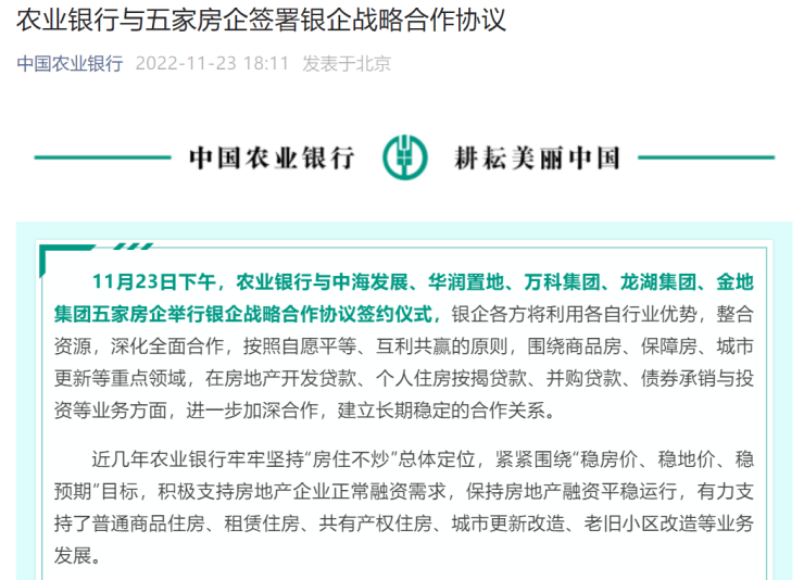 同日,中国农业银行发布消息称,与中海发展、华润置地、万科集团、龙湖集团、金地集团五家房企举行银企战略合作协议签约仪式,银企各方将利用各自行业优势,围绕商品房、保障房、城市更新等重点领域,在房地产开发贷款、个人住房按揭贷款、并购贷款、债券承销与投资等业务方面,进一步加深合作,建立长期稳定的合作关系。
