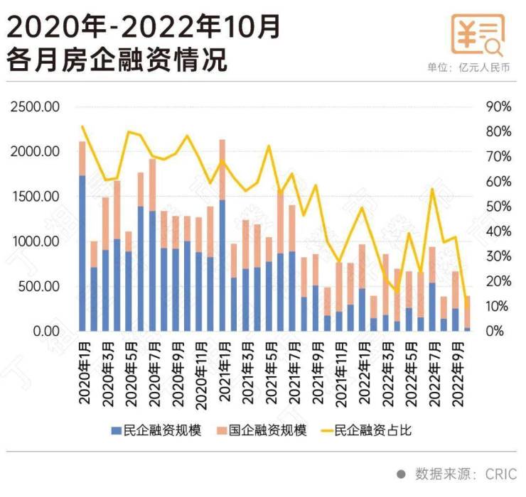 据克而瑞对100家典型房企的融资监测显示,民营房企融资规模的占比从2021年8月首次跌破50%之后持续下跌,至今年10月时仅占10%。2022年前10月,民营房企累计融资总额2291亿元,同比减少68%,其中债券发行规模同比减少58%。