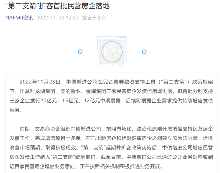 中国银行间市场交易商协会(以下简称交易商协会)官网也在11月23日披露,中债信用增进投资股份公司(以下简称中债增进公司)在民企债券融资支持工具(“第二支箭”)政策框架下,出具对龙湖集团、美的置业、金辉集团三家民营房企发债信用增进函,拟首批分别支持三家企业发行20亿元、15亿元、12亿元中期票据,后续将根据企业需求提供持续增信发债服务。