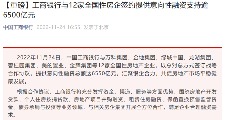 11月24日,中国工商银行发布消息称,与万科集团、金地集团、绿城中国、龙湖集团、碧桂园、美的置业、金辉集团等12家全国性房地产企业,以总对总方式签订战略合作协议,提供意向性融资总额达6550亿元。