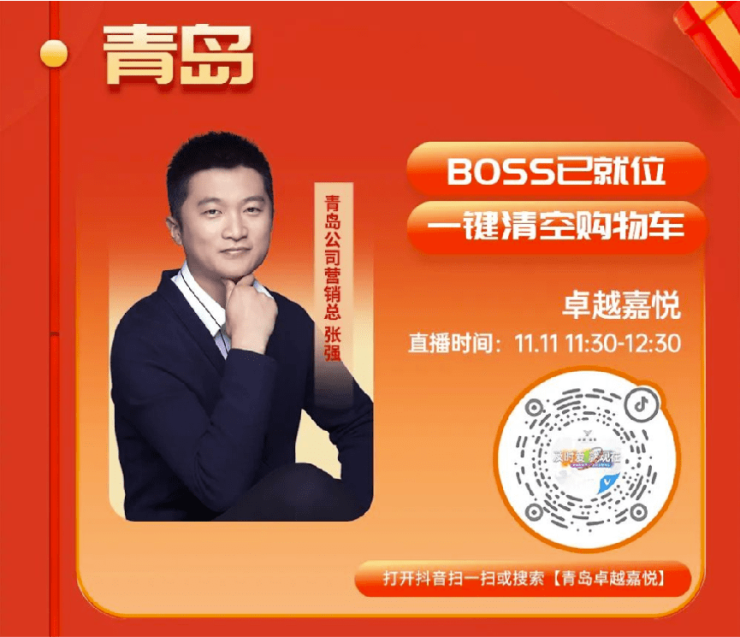 11月11日11:30-12:30,青岛先进嘉悦抖音直播间,青岛公司营销总“价”到,以1%购物车清空基金掀起一场岛城狂欢,一小时12轮抽奖,就等你来!更有先进·锦鸿台、先进·中寰、先进·玺悦三大分会场,红包、大牌家电大放送,好礼狂撒,千万好礼花落你家!