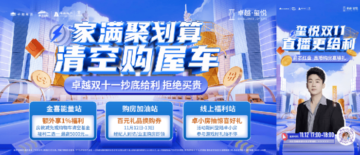 先进·玺悦双十一期间认购即享额外1%优惠,享房款减免金或购屋车清空基金;11月12日-13日,经纪人到访或业主购房即送百元礼品换购券;活动期间登陆卓小房游戏,线上抽惊喜好礼,福利享不停!