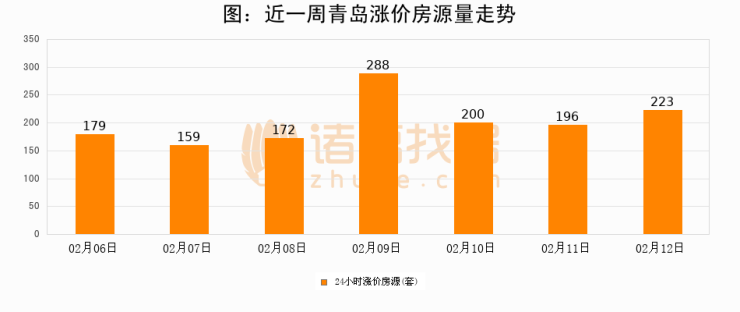 根据诸葛找房数据显示,青岛24小时涨价房源量为223套,较02月11日增加27套,环比上涨13.8%。与此同时,涨价房源占比小幅扩大,业主信心有所提升。