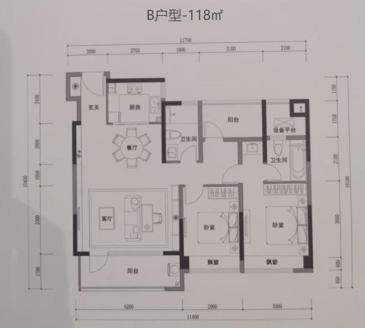 该户型建面118平,5.2米大横厅设计,非常阔绰大气。双南卧带飘窗,北向可改造做客卧或书房。厨房、餐厅、客厅南北贯通一体,彰显开阔感。餐厅空间比较方正可容纳六座位,比较舒适。