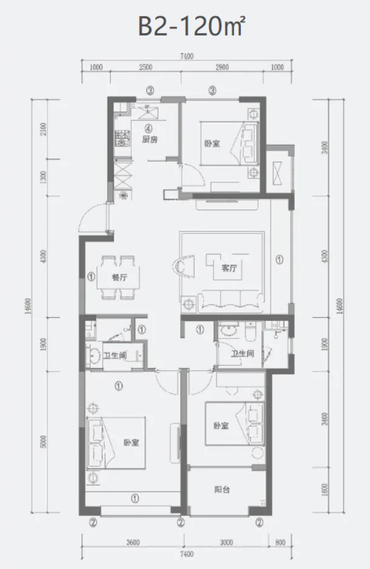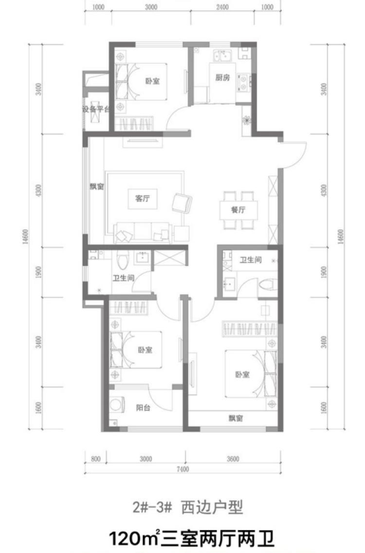 此户型为120平米西边户,西向客厅带飘窗,双南卧,主卧面积达18平米带飘窗和独立卫生间,南向次卧带阳台,北向次卧面积近10平米,空间阔绰。该户型与上边提到的东边户格局相同,空间大小一致。