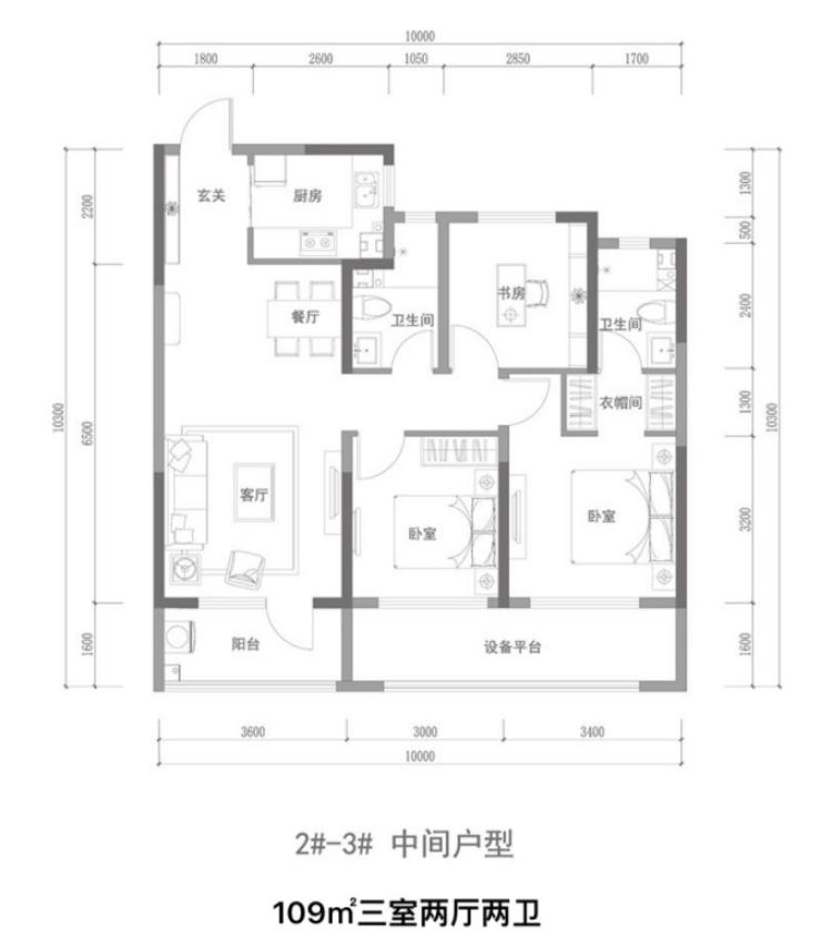 109平米三室两厅两卫户型,户型方正,南北通透,三阳台设计,双南卧南厅带阳台,主卧带独立卫生间保证私密性,北向书房。