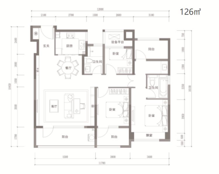 该户型建面126平,为套三可变套四户型。三阳台,客厅5.3米大面宽,主卧带独立卫生间和阳台,次卧带南向阳台保证晾晒功能。