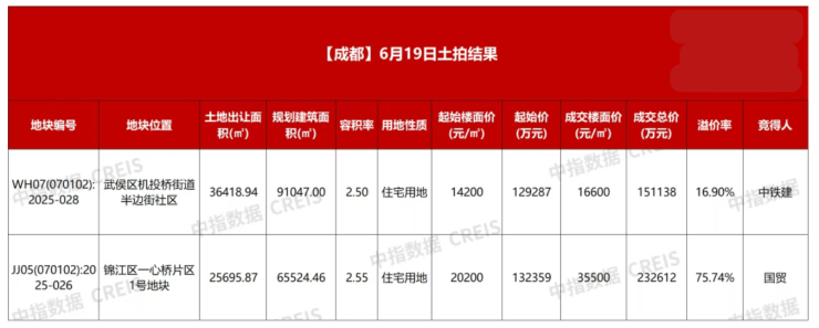 同日出让的另一宗位于武侯区机投桥街道的地块,则由中铁建以总价15.11亿元、楼面价16600元/平方米、溢价率16.90%竞得。