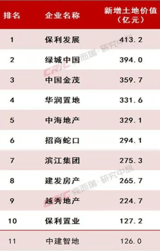 另据克而瑞监测数据,今年前5个月,共计11家房企新增土地价值超百亿元。其中,保利发展新增土地价值413.2亿元,稳居首位;绿城中国、中国金茂、华润置地、中海地产新增土地价值均超过300亿元。