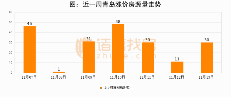 根据诸葛找房数据显示,青岛24小时涨价房源量为30套,较11月12日增加19套,环比上涨172.7%。与此同时,涨价房源占比小幅扩大,业主信心有所提升。
