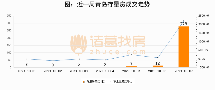从存量房来看,2023年10月07日青岛存量房单日成交278套,比昨日增加266套,环比上涨2216.7%。从近一周存量房成交来看,青岛存量房日均成交套数为43套,10月07日单日成交278套,高于近一周平均水平546.5%。
